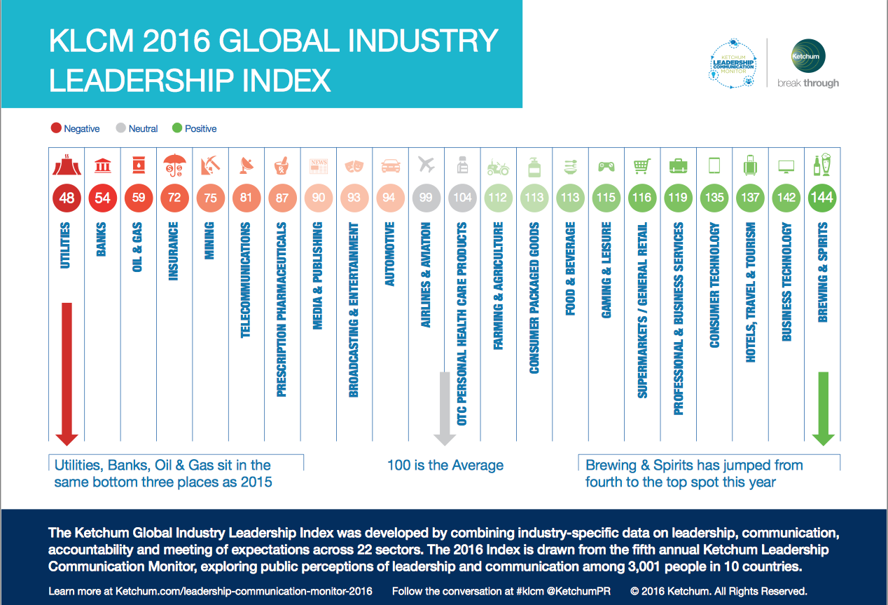 Segundo a Ketchum, na raiz deste aprofundamento da crise global de confiança em líderes políticos está a percepção de que eles estão administrando as coisas certas de forma errada e gerenciando certo as coisas erradas. Nas três áreas de maior importância para os pesquisados (corrupção, economia e educação) há uma lacuna considerável entre a importância dos problemas e a efetividade dos líderes políticos em enfrentá-los. Antes das convenções partidárias dos EUA, em meados de julho, e após votação do Reino Unido, que aprovou a saída da União Europeia, a mensagem de "deve fazer melhor" para os líderes políticos de todo o mundo não poderia ser mais clara, conclui o estudo.